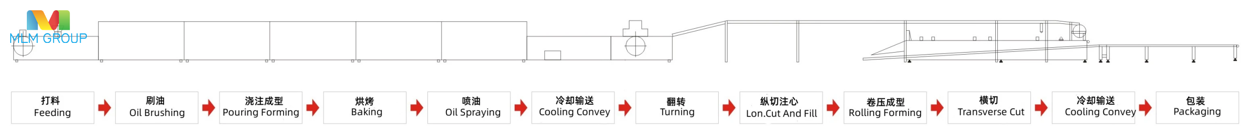 Прямо выливают мякоть на стальную ленту, смазанную маслом, и помещают в печь для выпечки. После созревания она принимает форму ленты. После того, как ее перемещают на конечную точку и опрыскивают маслом, она возвращается с нижней части для транспортировки. В это время лента с коржом переворачивается. При транспортировке обратно к нижней части позиции наполнения она поднимается с наклона на рабочую платформу, разрезается продольно на кусочки, наполняется начинкой и переворачивается один за другим. Готовый кусочек кладется на другой кусочек и немного уплотняется. После поперечной резки формируется новый фаворит рынка — европейский швейцарский рулет.